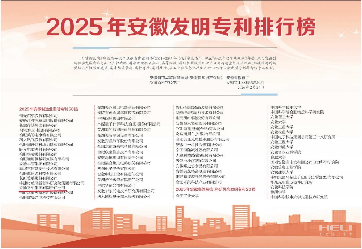 近日,安徽省市场监督管理局(安徽省知识产权局)、安徽省教育厅、安徽省科学技术厅、安徽省工业和信息化厅联合发布“2025年安徽发明专利排行榜”,集团公司凭借卓越的创新能力与知识产权优势,成功入选安徽省制造业发明专利50强,彰显行业领军地位。